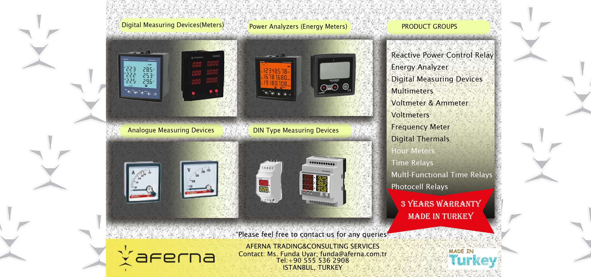 You can also facilitate Aferna product ranges, which are already studied according to clients requests in the ongoing time. You will always find at least 3 different manufacturer alternatives for each product range. We will update you by newsletters or advertising emails if you like to register your email address to us...