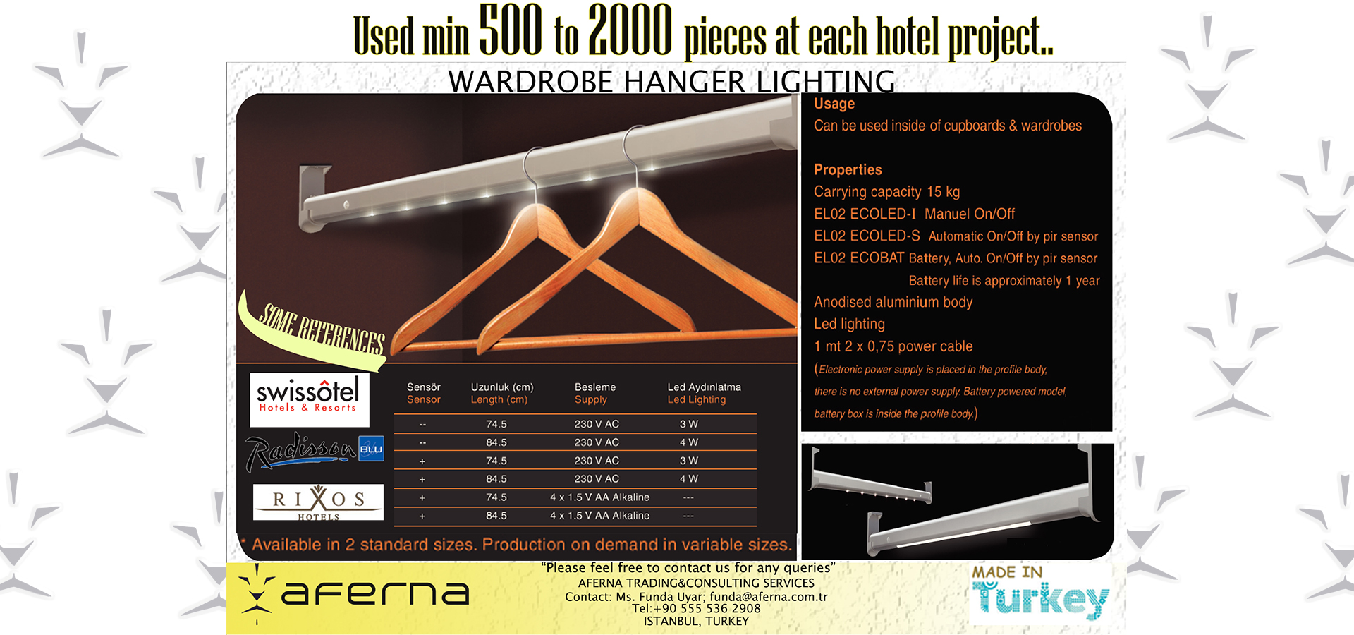 Aferna's first aim to find relevant products from different big or small manufacturers regarding to its clients requests. *Market research, negotiating and finding targeted price levels in Turkey. *Consulting new production agreements with manufacturers and clients. *Exportation relevant to receivers customs rules...